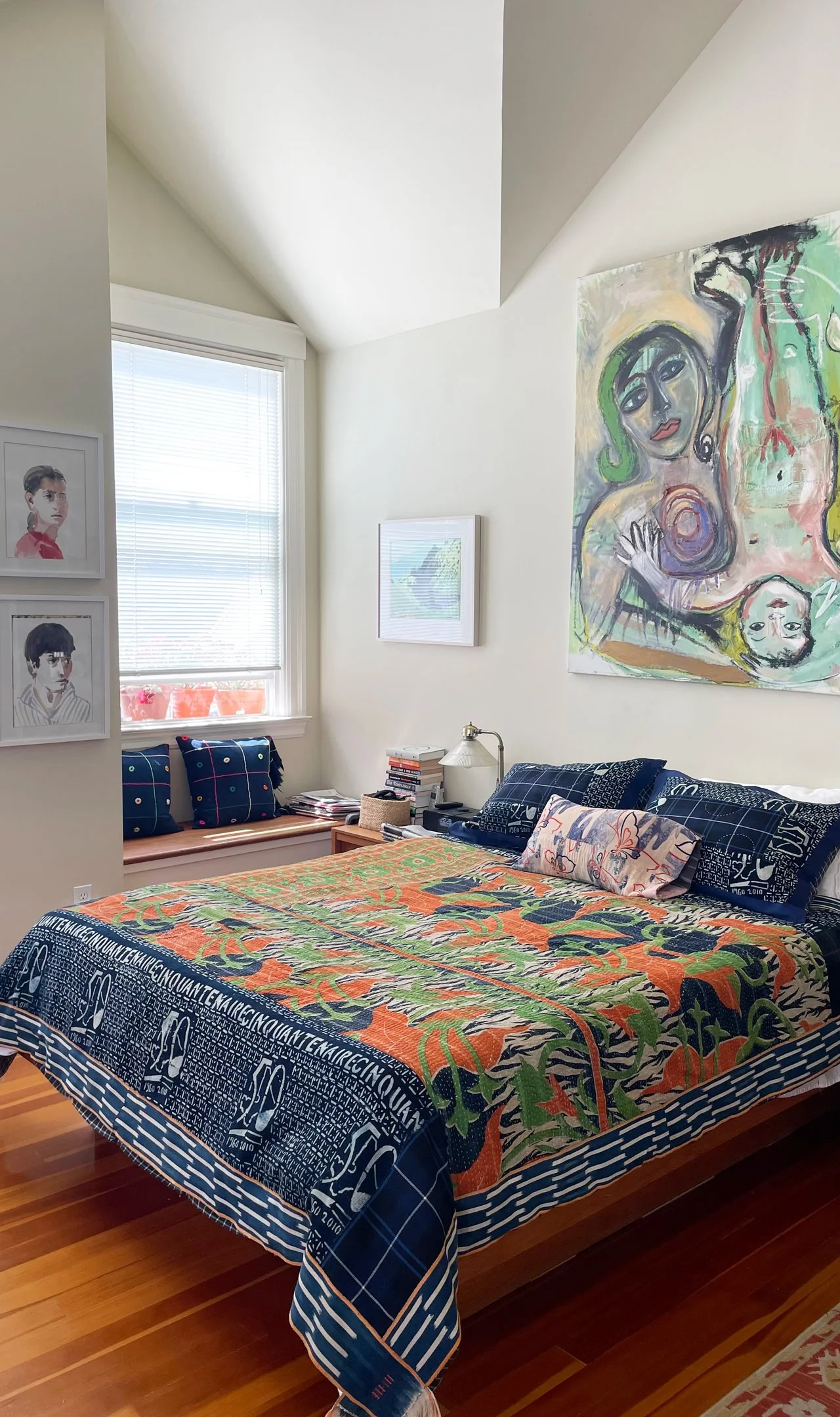 About a year ago I went to the Alameda Flea Market with my daughter Jo to see what we could find among the assortment of clothing, furnishings and memorabilia from different countries and eras. I found an indigo blanket from Mali which had a 50 year anniversary message which resonated, having been together with my husband for almost that long. Jo found a silk wrap from Japan which she thought could make a nice table runner for her apartment she shares with her newly wed husband. Exploring more, I found a hand stitched Kantha fabric from India I loved, and suddenly I was fabricating a new quilt for our marital bed, to replace the worn paisley pattern from Pottery Barn we’ve had forever. By the time we were ready to leave I’d also picked up more African fabric with visions of throw pillows, one adorned with colorful crochet rings, plus a Japanese silk apron with butterflies and garden flowers, to recover my mother’s vanity table bench.